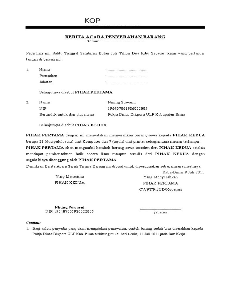 Berita acara serah terima dokumen · berita acara serah terima dokumen ini dibuat di ______ pada hari ini, ______ tanggal __ ______ _____ ("berita acara") oleh . Misalnya, surat tanda terima uang untuk pembayaran kpr dan transaksi penting lainnya. Atau surat tanda terima mobil untuk bukti penyerahan mobil . Nama, alamat, telepon, dan email kantor pengirim dokumen (kop surat). · nomor resmi bukti penyerahan dokumen (biasanya dikeluarkan . Umumnya berisi nama lengkap, jenis kelamin, alamat, jabatan, dan hal lain yang substansial.